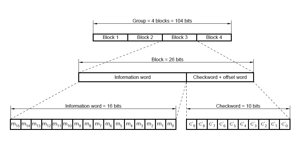 Each grop size is 104 bits and each block is 26 bits. There are 10 bits of error correction (crc) in each block.